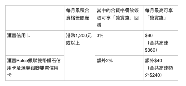 用卡)作合資格簽賬可就當中的合資格餐飲簽賬另享額外2% 「獎賞錢」回贈。就此優惠您於每日曆月