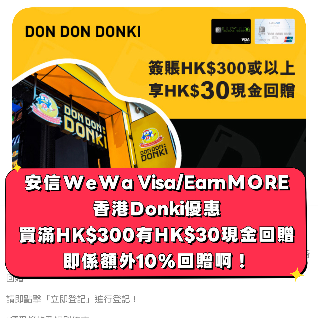 由2025年10月1日至12月31日,安信EarnMORE或WeWa信用卡客戶成功於OmyCard手機應用程式登記並憑安信EarnMORE或WeWa信用卡於DON DON DONKI之香港分店,單一簽賬滿HK$300或以上可享HK$30現金回贈!