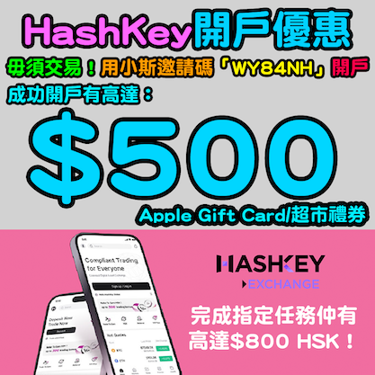 【HashKey小斯獨家開戶優惠】毋須交易!開戶就有$500 Apple Gift Card/超市禮券!完成指定任務仲有高達$800 HSK!可定期購買數字資產,積少成多,享受長期收益!虛擬資產保險覆蓋全球第一!香港最大持牌數字資產交易所!