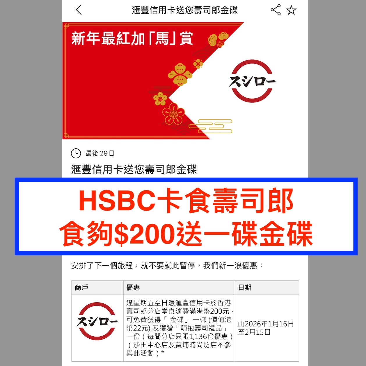 1. 客人須於 2026 年 1 月 16 日至 2 月 15 日期間的星期五、六及日,於香港壽司郎分店作單一堂食消費滿港幣$200*或以上,以及以滙豐信用卡結賬。*加一後之實際付款金額。