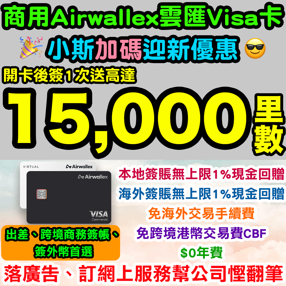 小斯又多張公司卡有優惠啦!$0年費Airwallex雲匯Visa卡!海外、本地商務消費無上限1%現金回贈,仲要免海外交易費用,亦都無跨境港幣交易費CBF!由2025年10月1日至10月31日,經小斯成功申請Airwallex雲匯Visa卡:
