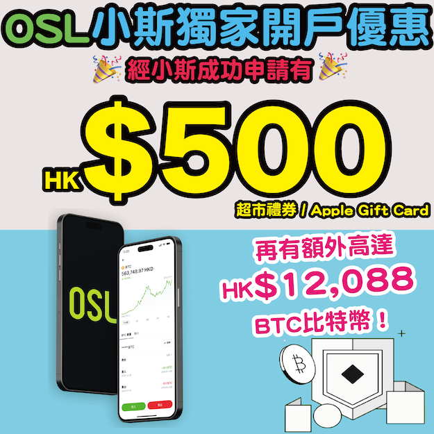 2025年6月1日至2025年6月30日 ,經小斯成功開戶OSL有$500超市禮券 / Apple Gift Card!