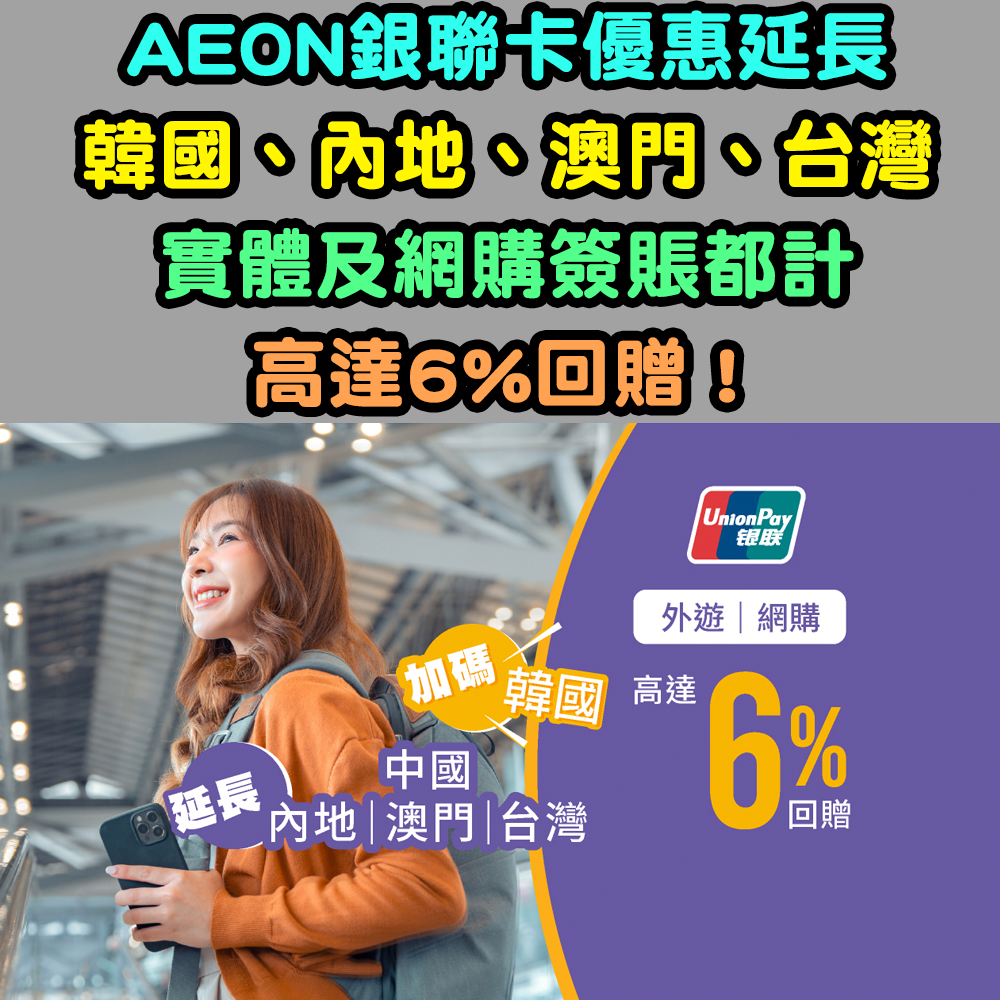 AEON銀聯卡成日去外遊有優惠,今年加推韓國!大陸、澳門、台灣優惠都延長左呀!高達6%現金回贈!網購都適用架!記得要去AEON app登記咗先!由2025年12月1日至1月31日: