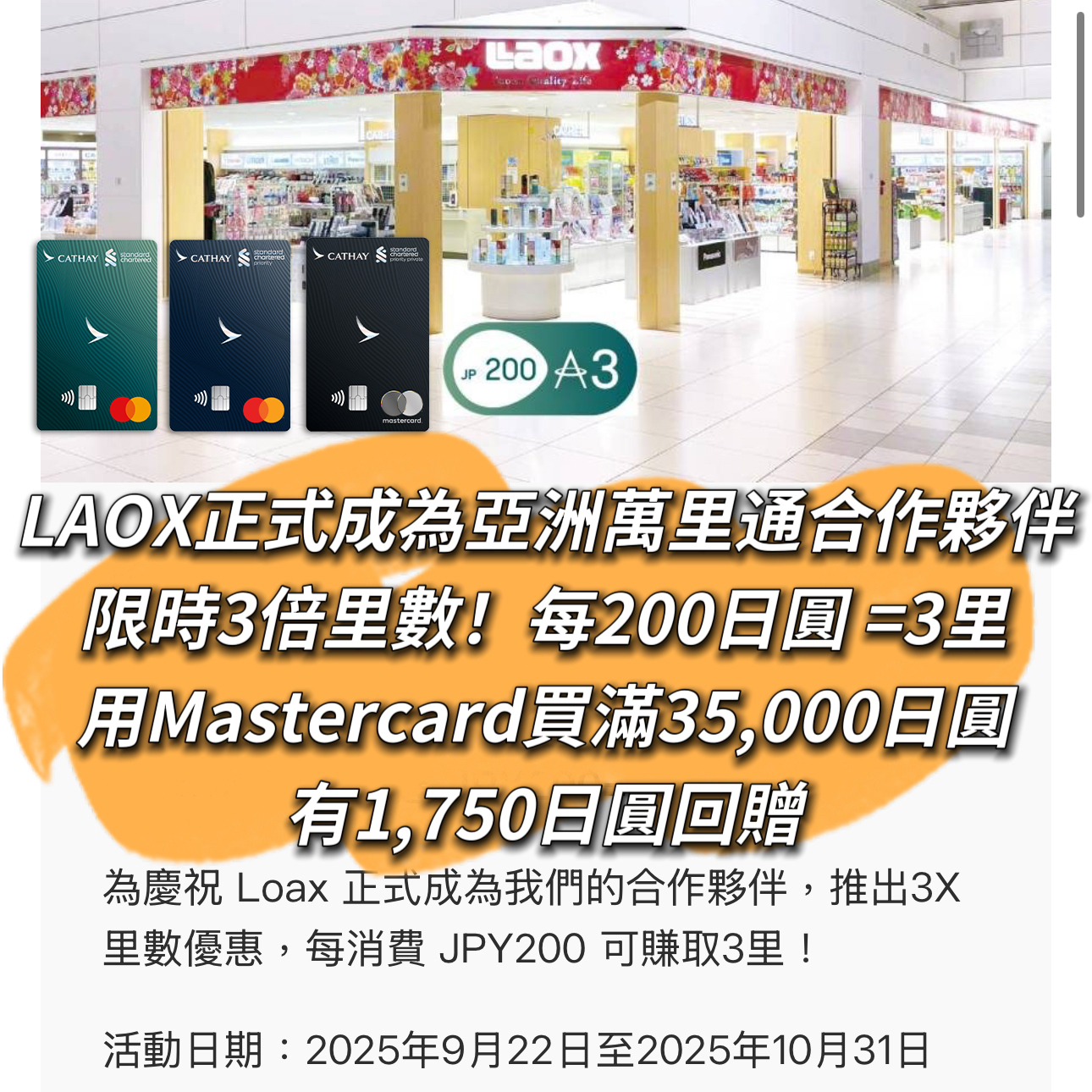 【LAOX正式成為亞洲萬里通合作夥伴】限時每200日圓=3里!Mastercard買滿35,000日圓有1,750日圓回贈!