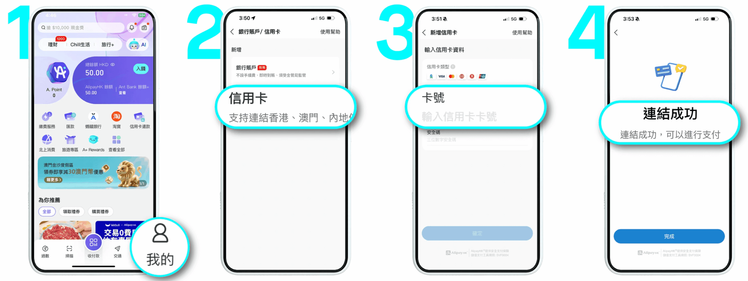 開AlipayHK app到「我的」→「銀行賬戶 / 信用卡」→ 按「新增」→ 輸入Mox Card資料,輕鬆綁定Mox Card至AlipayHK