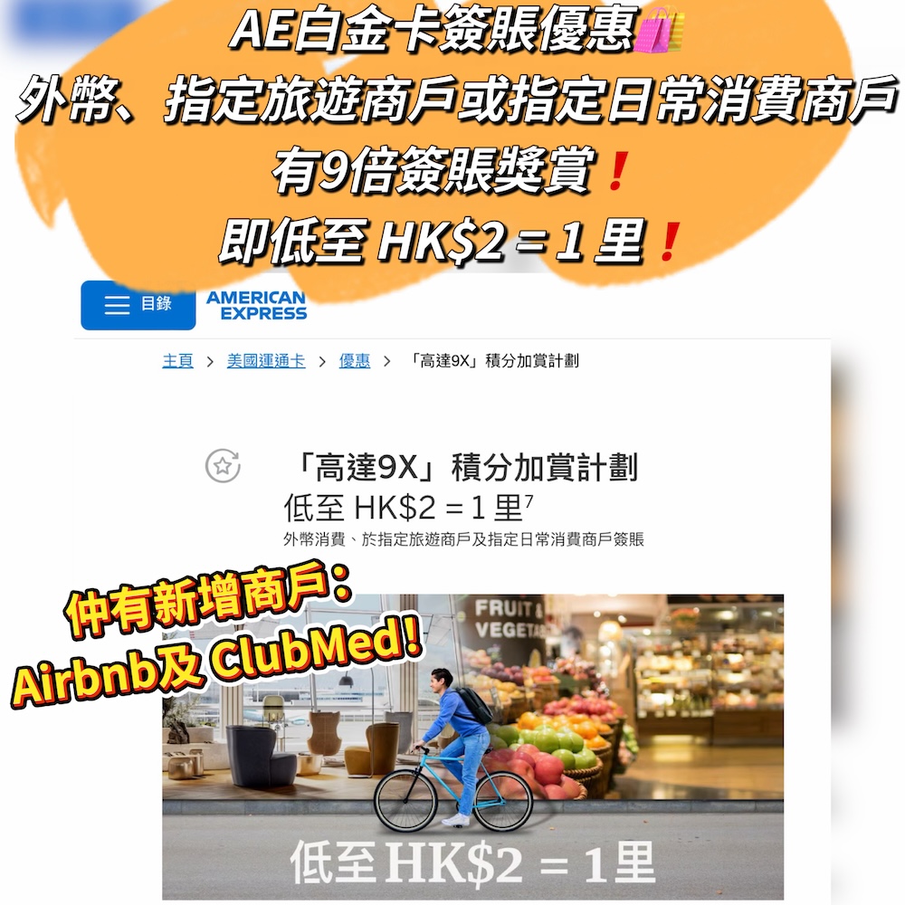 【🛍️AE白金卡(細頭)簽賬優惠❗❗🛍️】外幣、指定旅遊商戶或指定日常消費商戶簽賬有9倍簽賬獎賞❗低至 HK$2 = 1 里❗包括Agoda、Expedia、Airbnb、惠康、百佳、Log-on及CITY’SUPER都有❗記得要登記啊❗