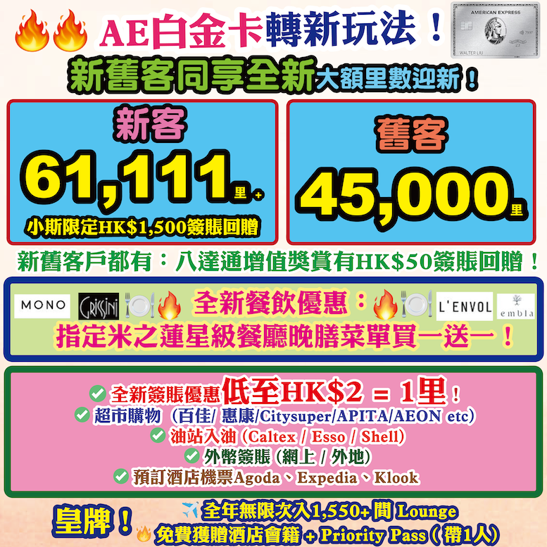 好驚喜❗好意外呀❗一直傳AE白金卡舊客無迎新❗AE 依然慷慨❗舊客仍然有大額里數迎新❗但新客有更大額里數迎新❗仲有小斯超限時獎賞❗即睇 HK$9,500年費但回本率極高新舊客迎新優惠❗
