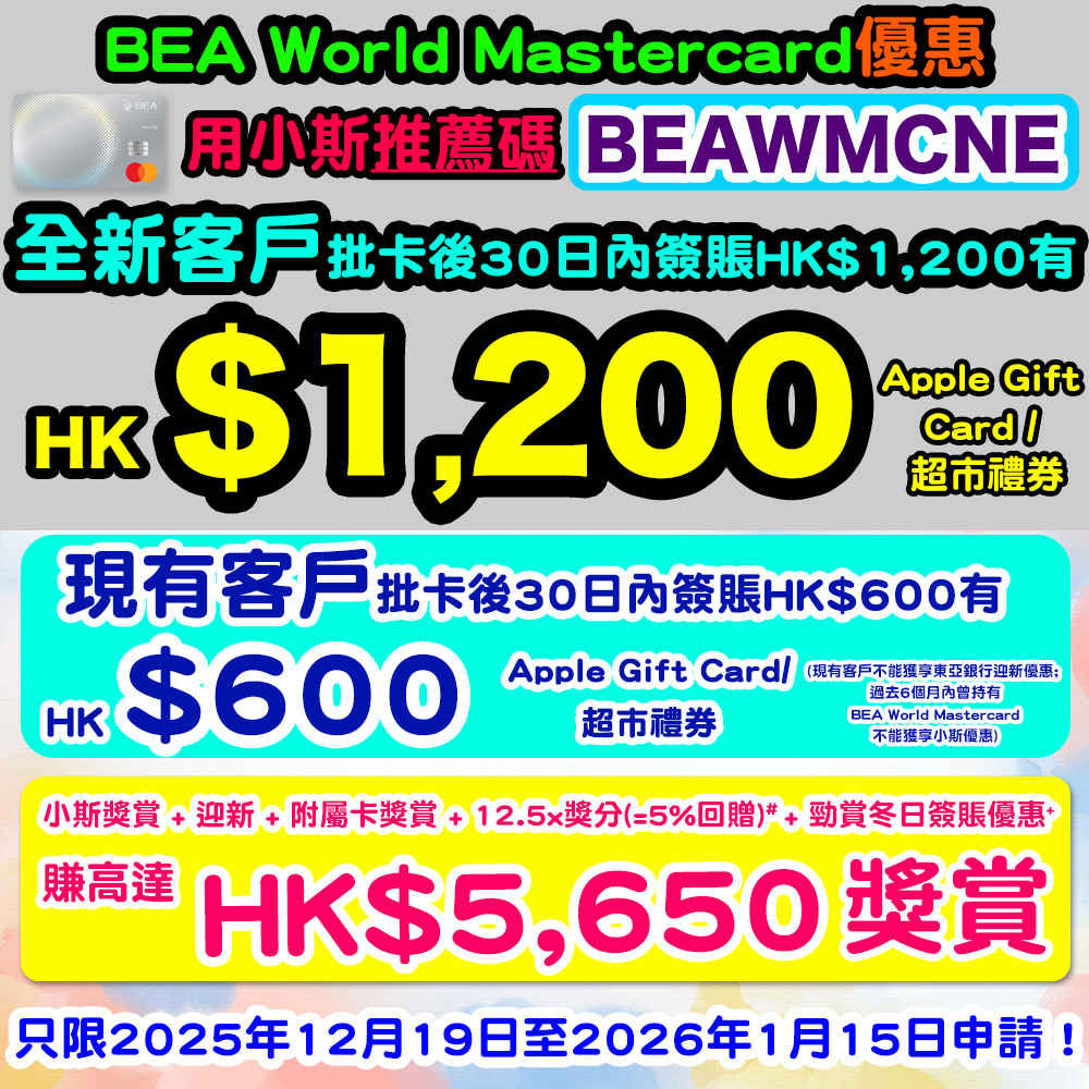 🎁2025年12月2日至12月22日,經小斯成功申請兼完成首次簽賬有HK$2,500簽賬回贈