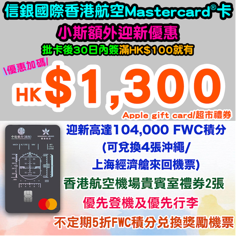 HK$1,300超市禮券 / Apple Gift Card (只適用於全新信用卡客戶):於2025年11月19日至至12月19日,全新信用卡客戶用小斯指定連結申請信銀國際香港航空Mastercard®卡,於2026年2月17日或之前成功批卡,及批卡後30日內作合資格簽賬滿HK$100,申請人需於信用卡批核後7日內填寫此表格以供核對,逾期不受理!同一申請參考編號只能於其中一份表格填寫一次,只可以領取一份額外獎賞,請勿重覆填寫!確認咗大家喺由我blog到申請而且張卡成功批核後,就會將禮券寄俾大家,前後大約3個月時間。