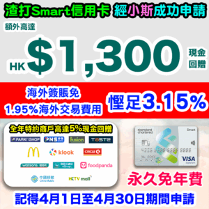 【渣打Smart信用卡小斯額外HK$500現金回贈】迎新高達HK$1,300現金回贈!指定商戶簽賬賺高達HK$3,000現金回贈!外幣簽賬免手續費慳高達3.15%!