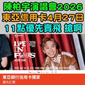【陳柏宇演唱會2026】東亞信用卡4月27日11點優先賣飛!搶啊!